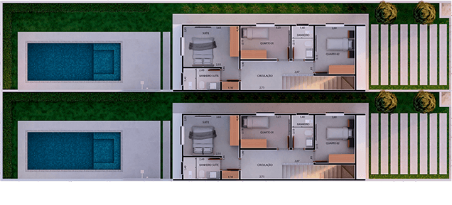 Casa dupla que une conforto, qualidade e um projeto arquitetônico contemporâneo. Implantada em um terreno de 360 m², conta com 104,85 m² de área construída, distribuídos de forma inteligente para garantir funcionalidade e bem-estar. O projeto contempla quartos bem dimensionados, sala de estar, cozinha, banheiro social, área de serviço e garagem, além de uma área gourmet com churrasqueira integrada ao espaço externo e piscina, criando um ambiente ideal para lazer, convivência e valorização do imóvel.