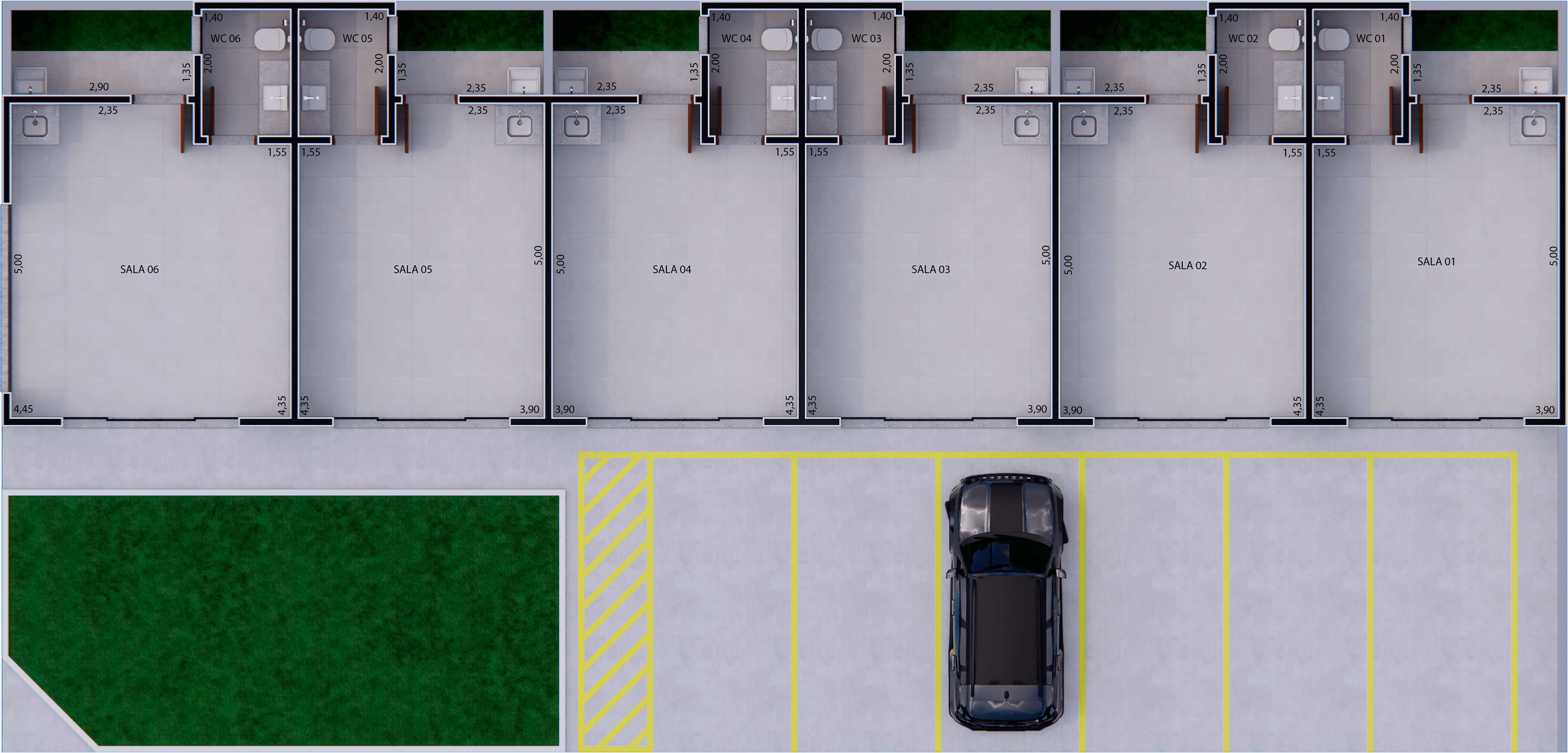 As unidades contam com banheiro social e área de serviço, garantindo praticidade e autonomia para cada operação. O projeto também dispõe de estacionamento, proporcionando maior comodidade para clientes e colaboradores.