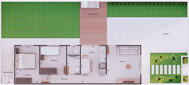Residência funcional e bem planejada, ideal para quem busca praticidade sem abrir mão do conforto. Com 180 m² de terreno e 57,37 m² de área construída, o projeto apresenta uma distribuição inteligente dos ambientes, contando com 2 quartos, sala de estar, cozinha integrada, banheiro social, área de serviço e garagem. O destaque fica por conta da área gourmet com churrasqueira, pensada para momentos de lazer, convivência e valorização do imóvel, tornando o projeto moderno, versátil e eficiente para o dia a dia.
