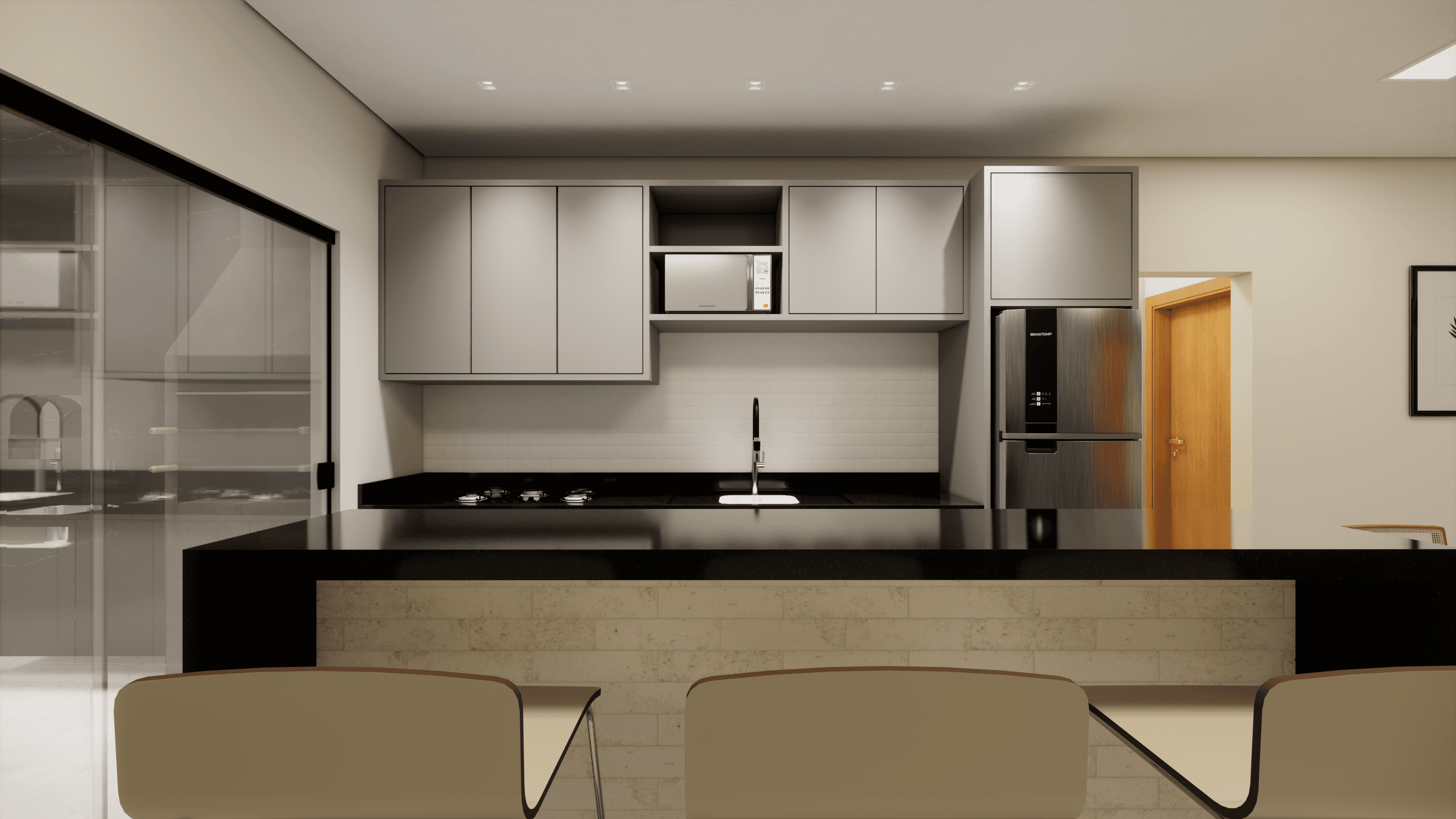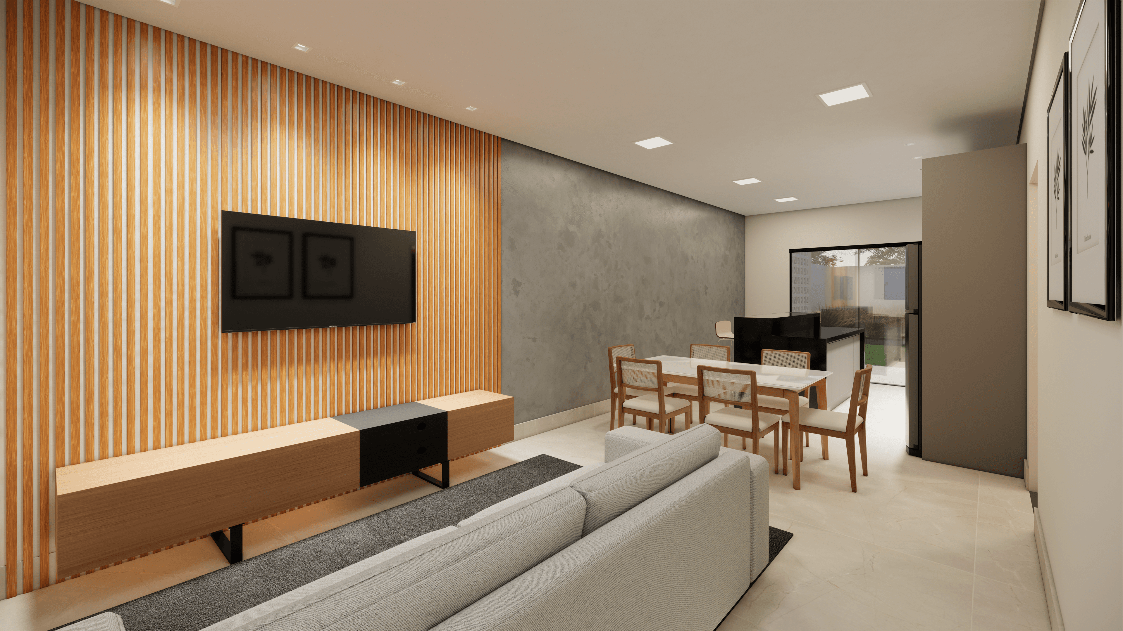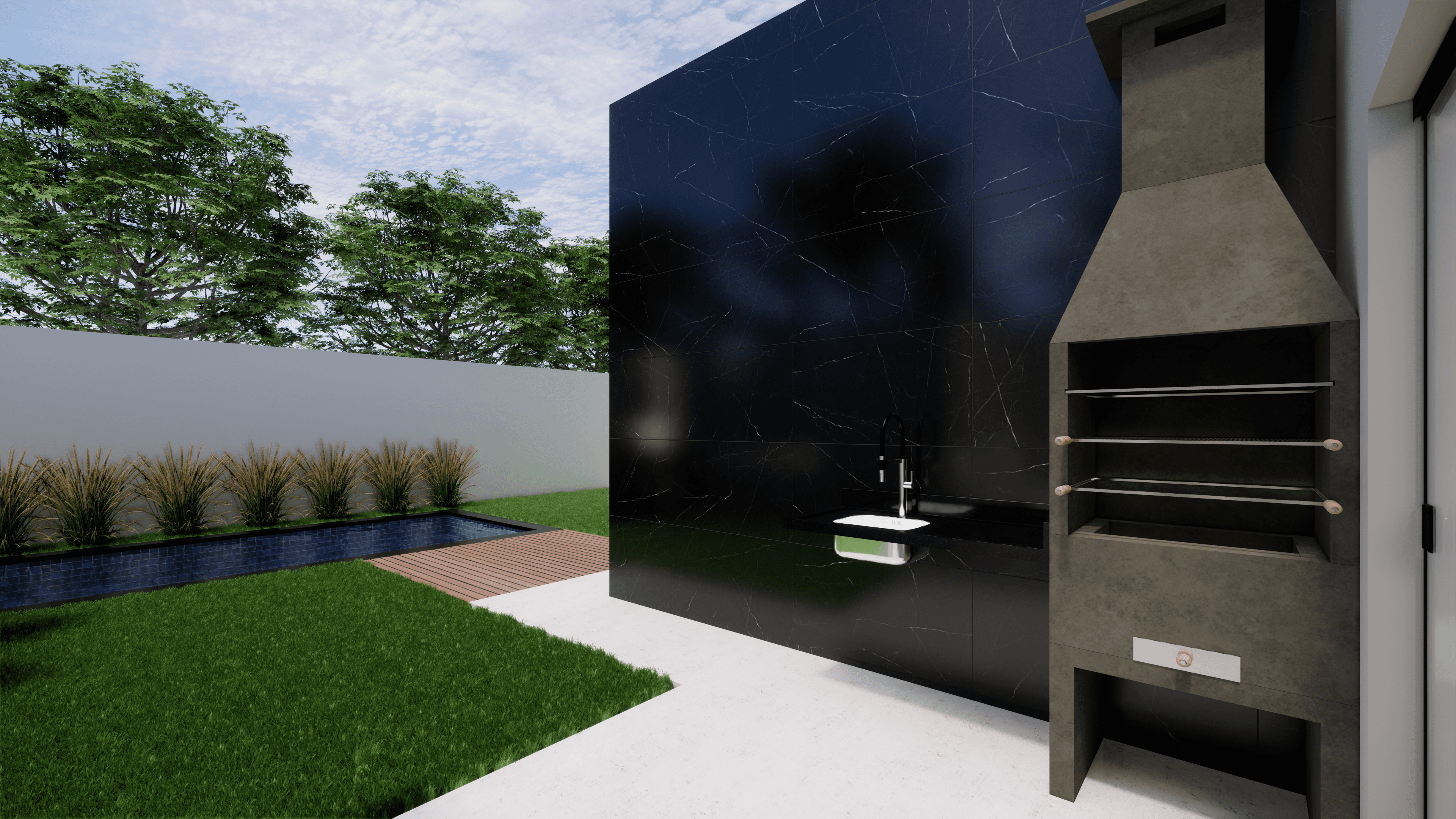No térreo, o projeto prioriza a integração dos ambientes, contando com sala de estar, sala de jantar, cozinha integrada, lavabo, área de serviço e garagem. A área externa dispõe de uma área gourmet com churrasqueira, integrada à piscina, ideal para lazer e convivência.