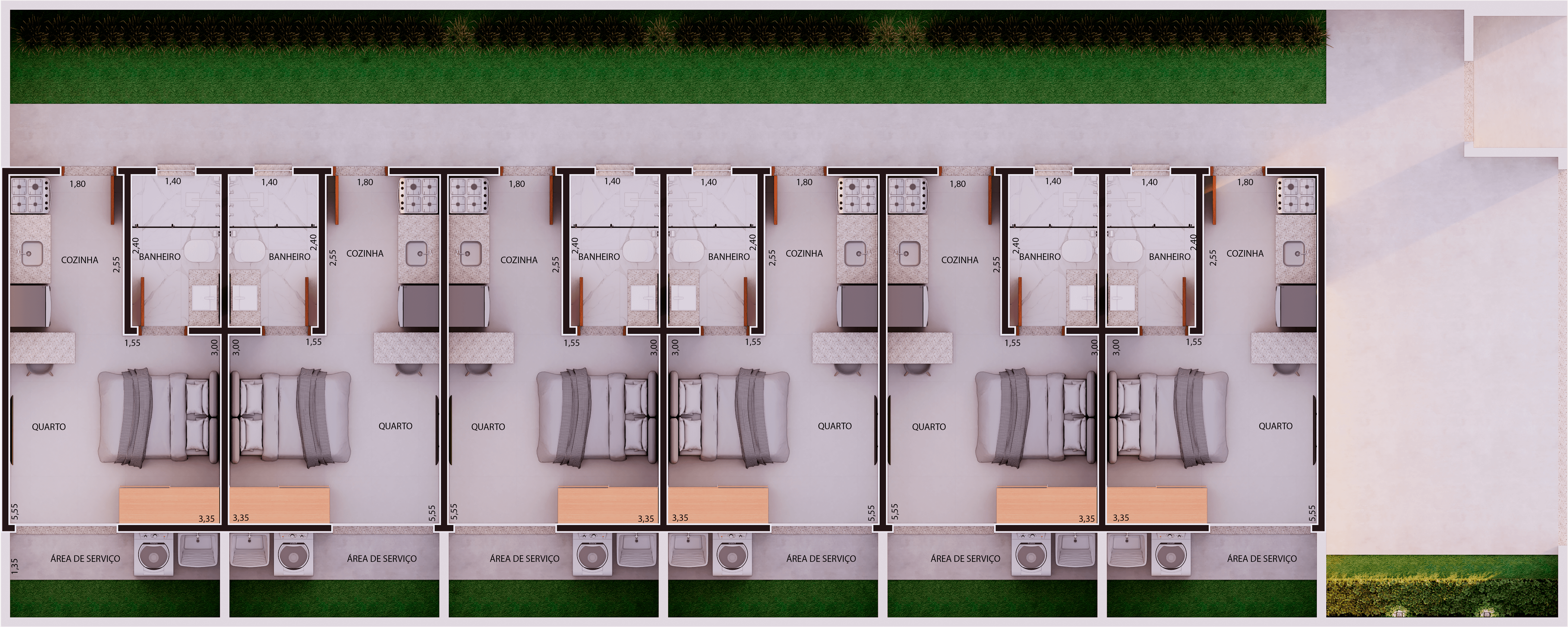 Cada unidade foi pensada para atender ao mercado de aluguel, oferecendo 1 quarto, cozinha, banheiro social e área de serviço, com layout funcional e baixo custo de manutenção.