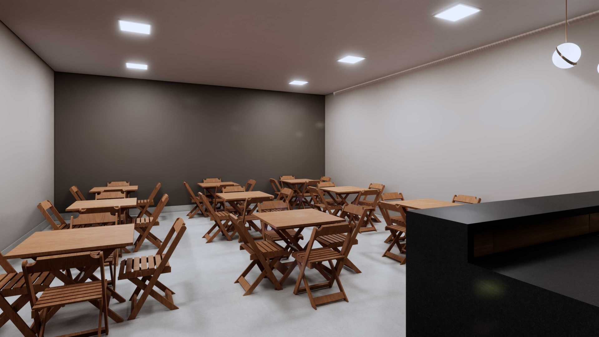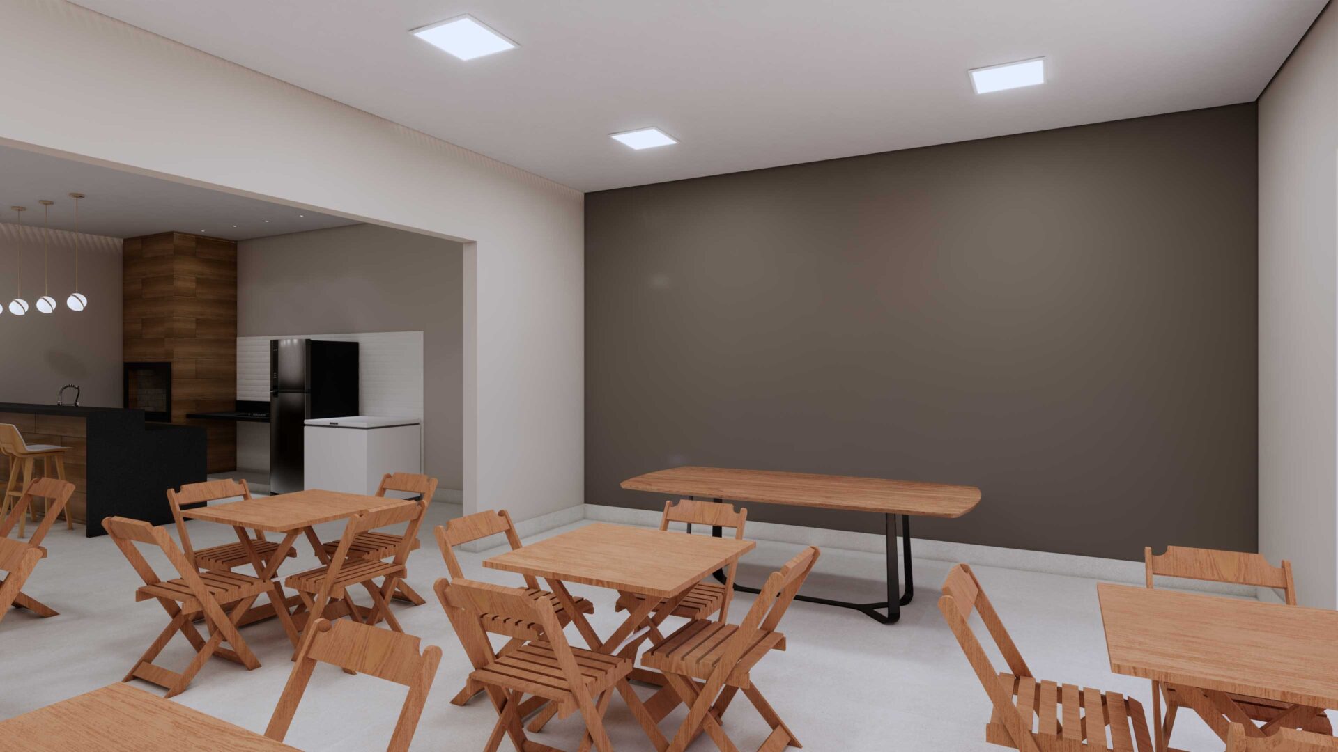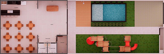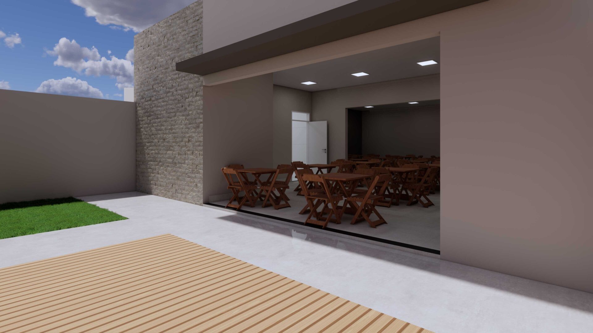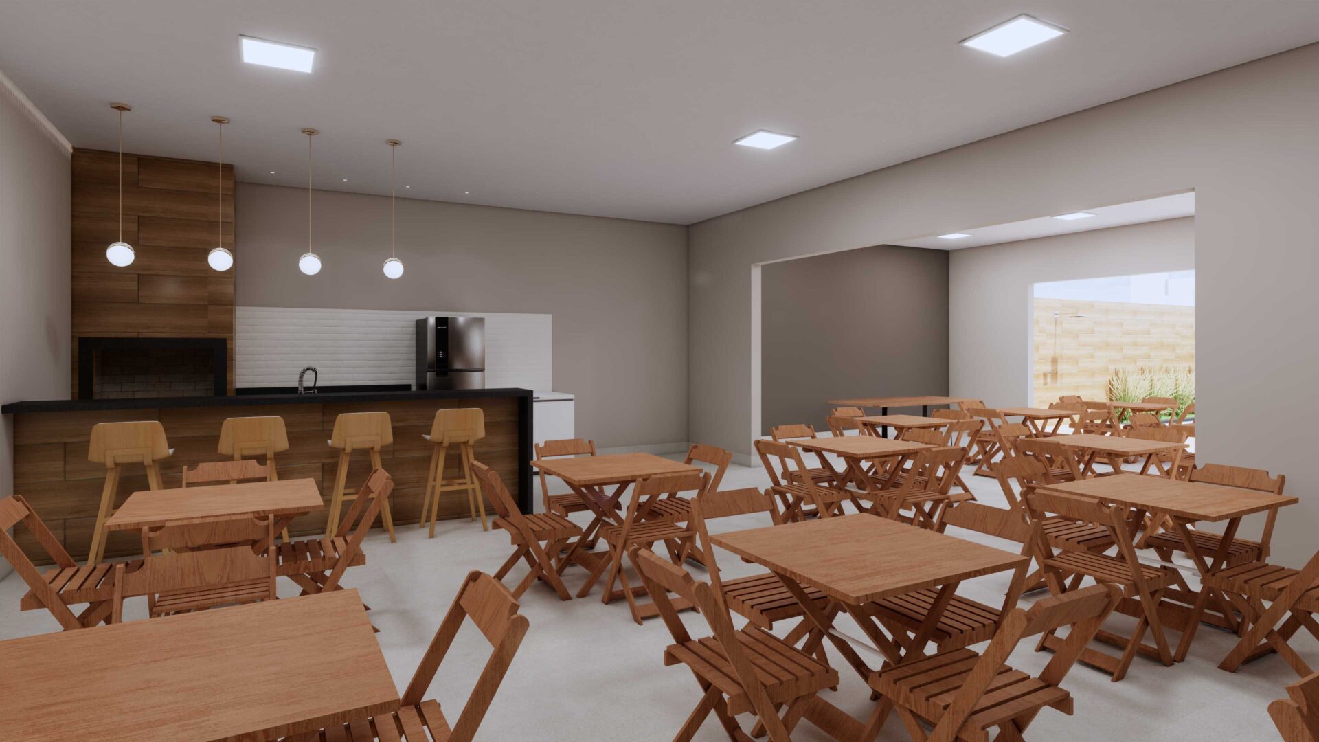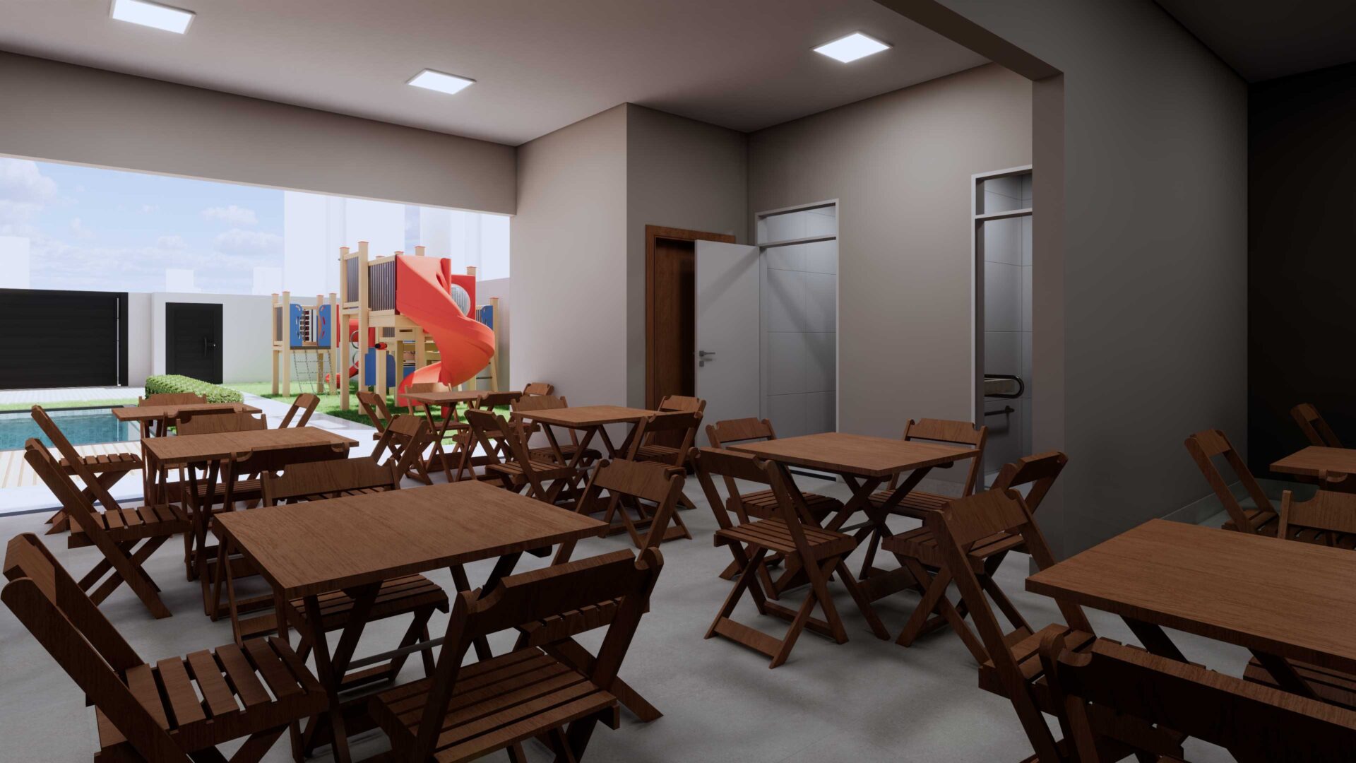 Salão de festas contemporâneo, projetado para lazer e convivência, com área gourmet integrada, salão amplo, banheiros, depósito e playground. O espaço conta ainda com piscina e áreas externas planejadas, unindo funcionalidade, conforto e lazer em um único projeto.
