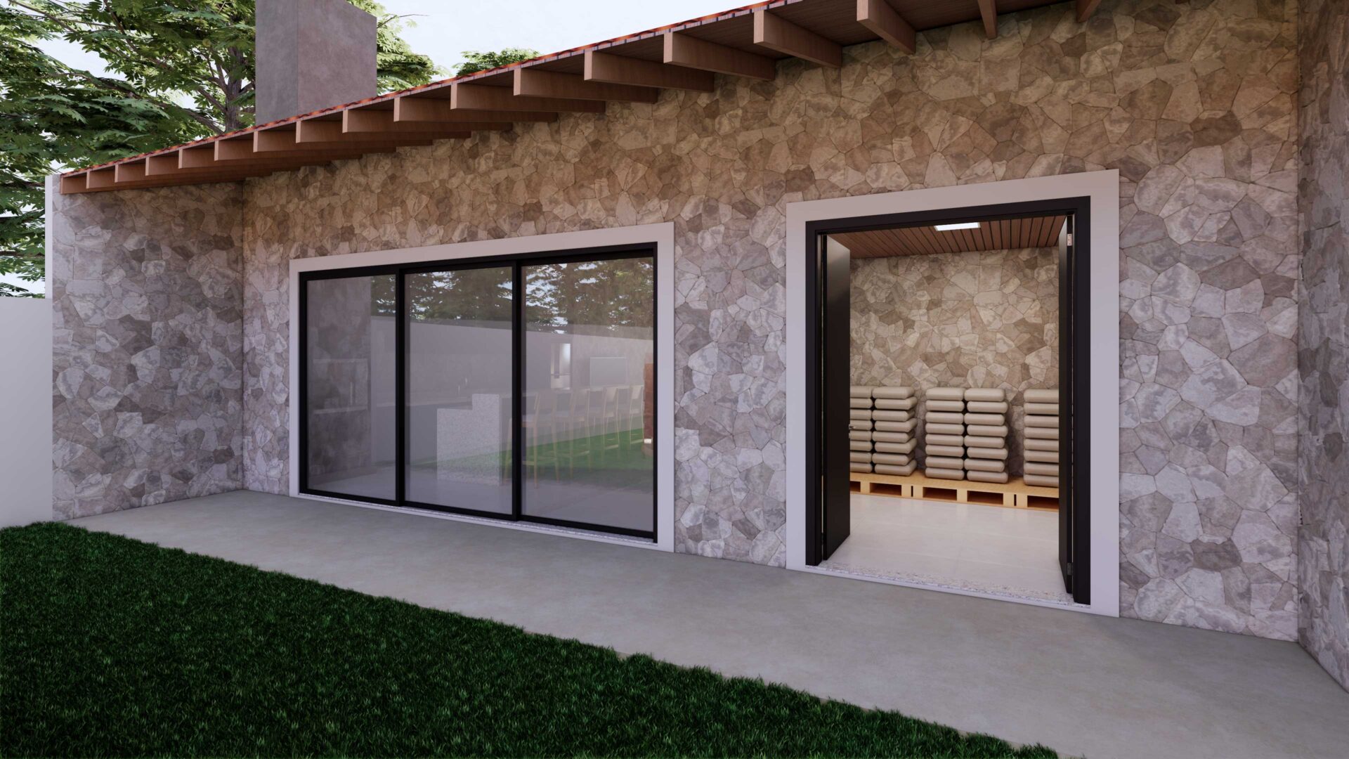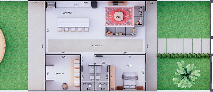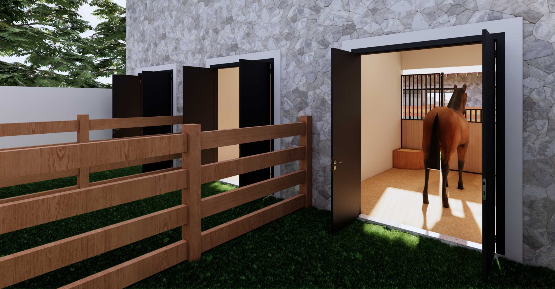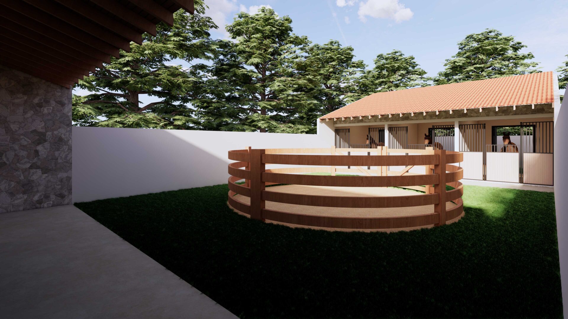 Projeto de haras funcional, implantado em terreno de 430 m², com 3 baias, área gourmet, área de limpeza, 2 banheiros, farmácia, depósito, suíte e ampla área de circulação, além de redondel/piquete. Conjunto planejado para manejo eficiente, conforto e apoio às atividades equestres.