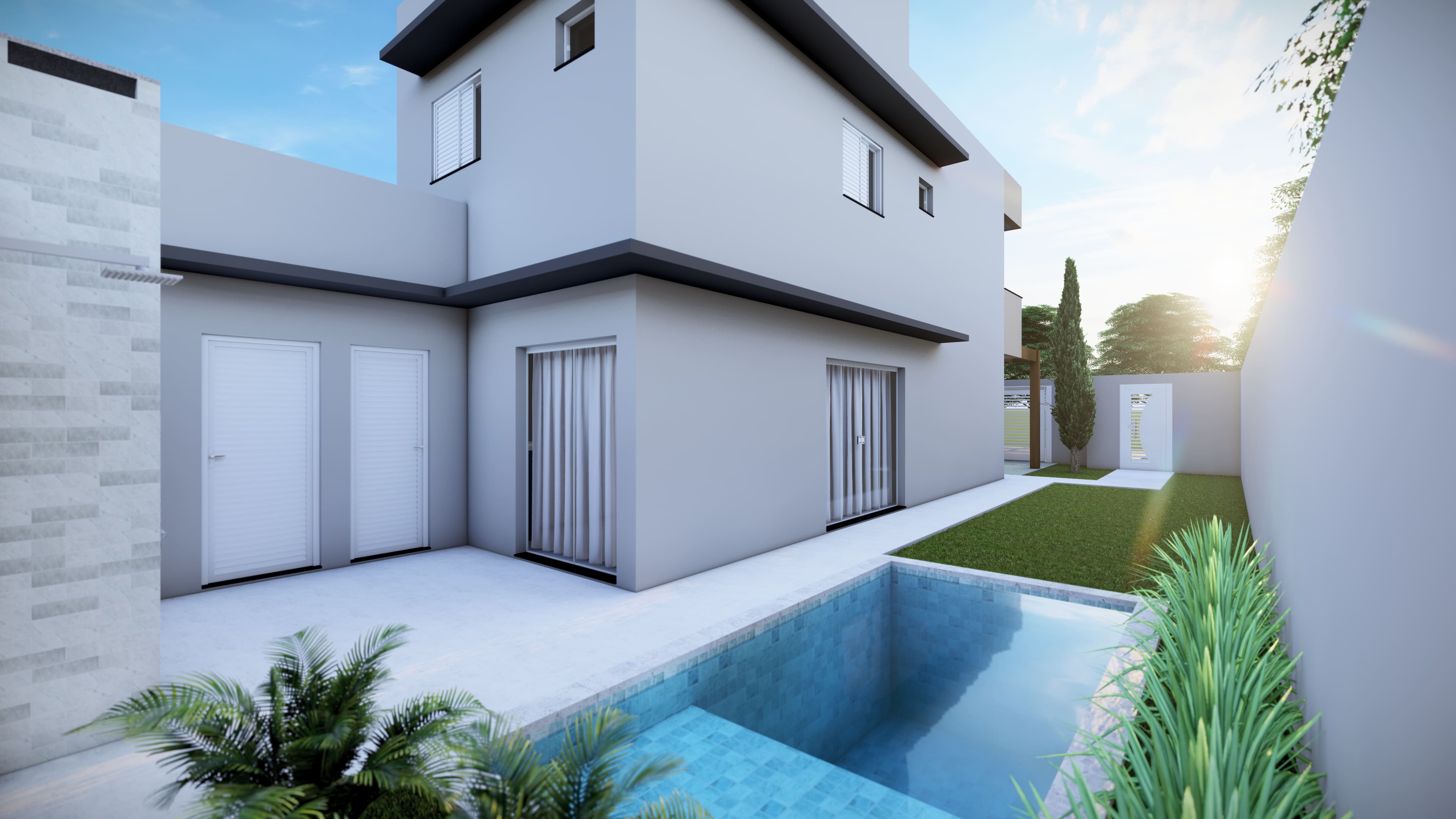 No pavimento térreo, o projeto conta com sala de estar e sala de jantar integradas, cozinha integrada, lavabo, área de serviço e garagem, proporcionando praticidade no dia a dia e ambientes bem distribuídos. A área externa é um dos destaques, com área gourmet com churrasqueira integrada à piscina, ideal para momentos de lazer e convivência.
