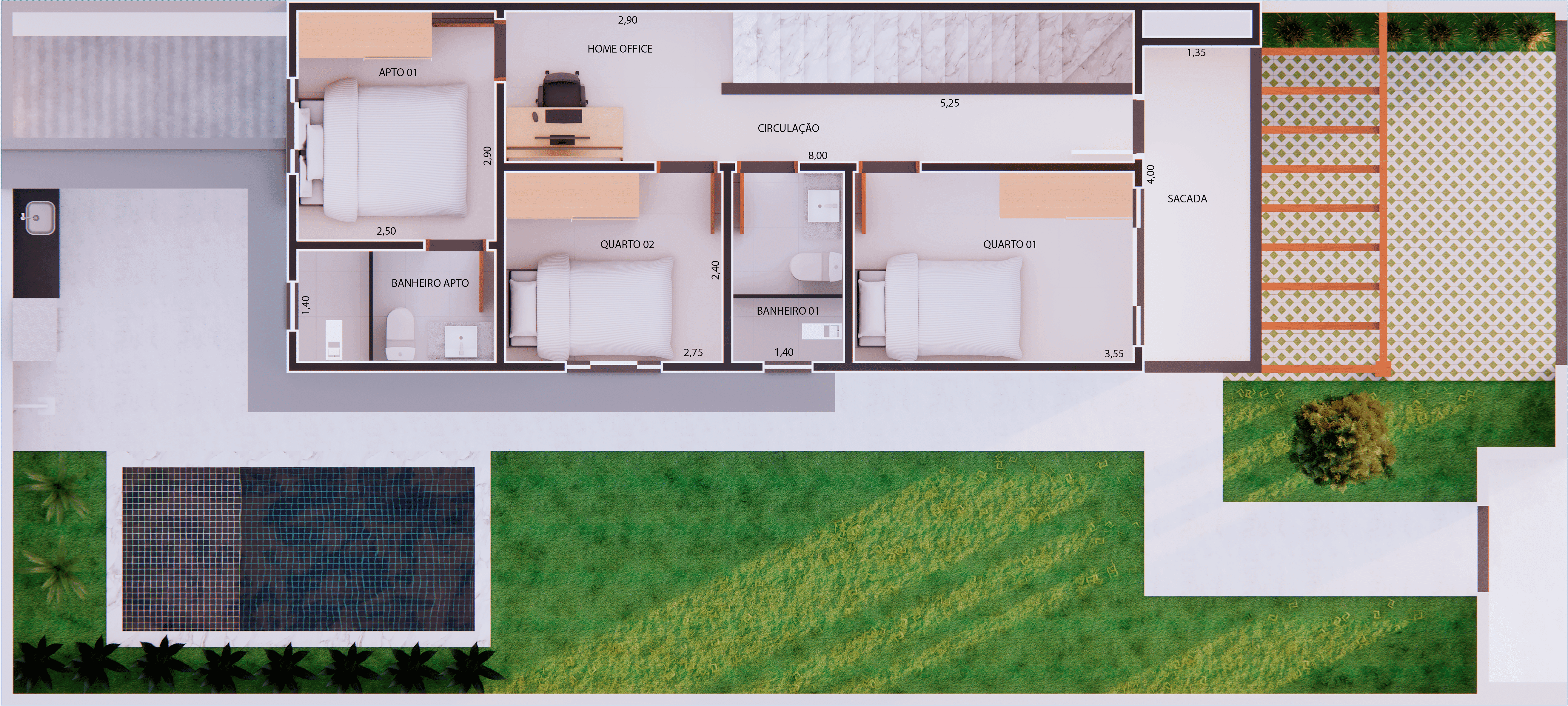 No piso superior, a área íntima oferece 1 suíte, 2 quartos, banheiro social e home office, garantindo conforto, privacidade e versatilidade para a rotina familiar ou trabalho remoto.