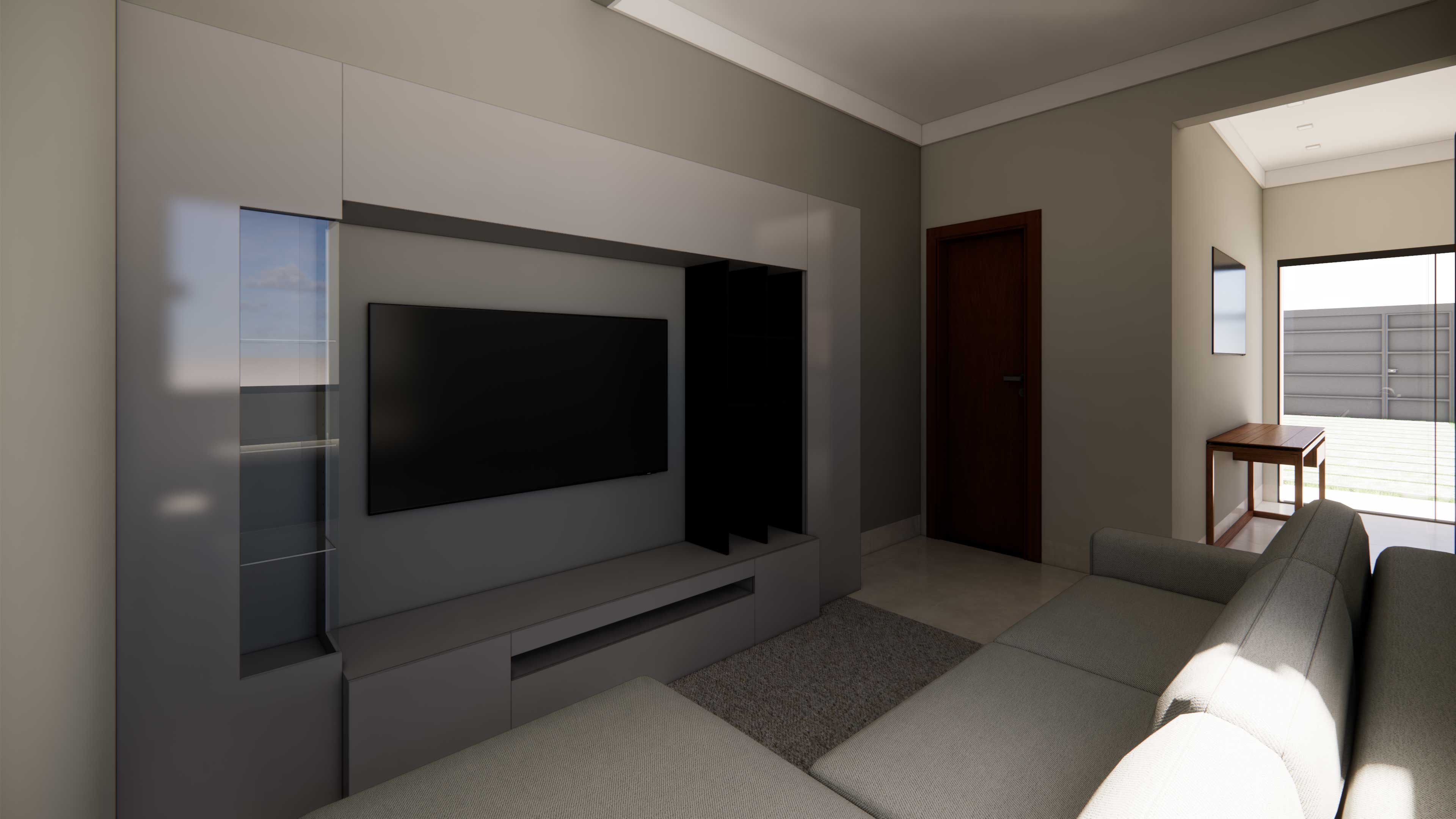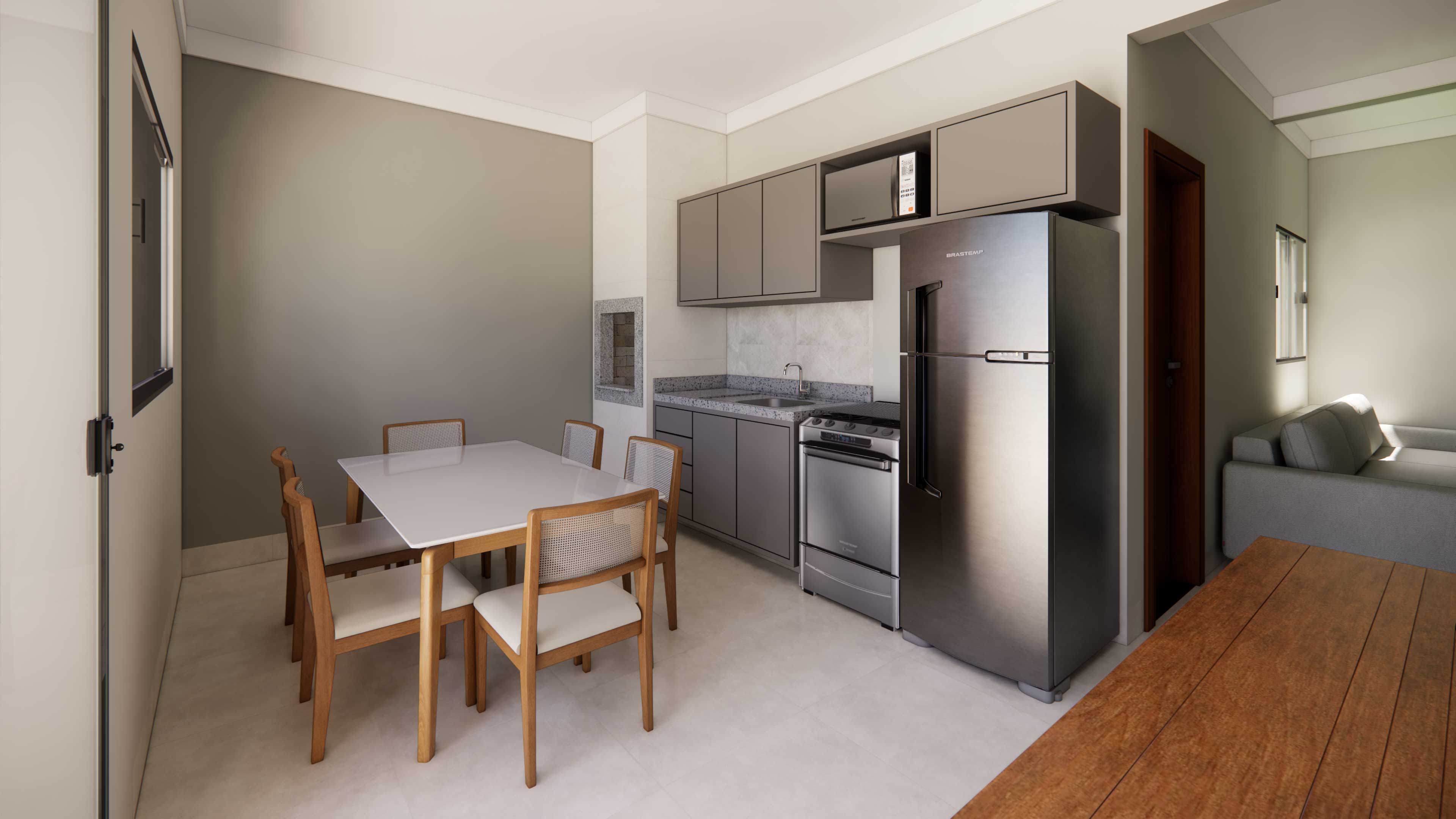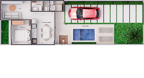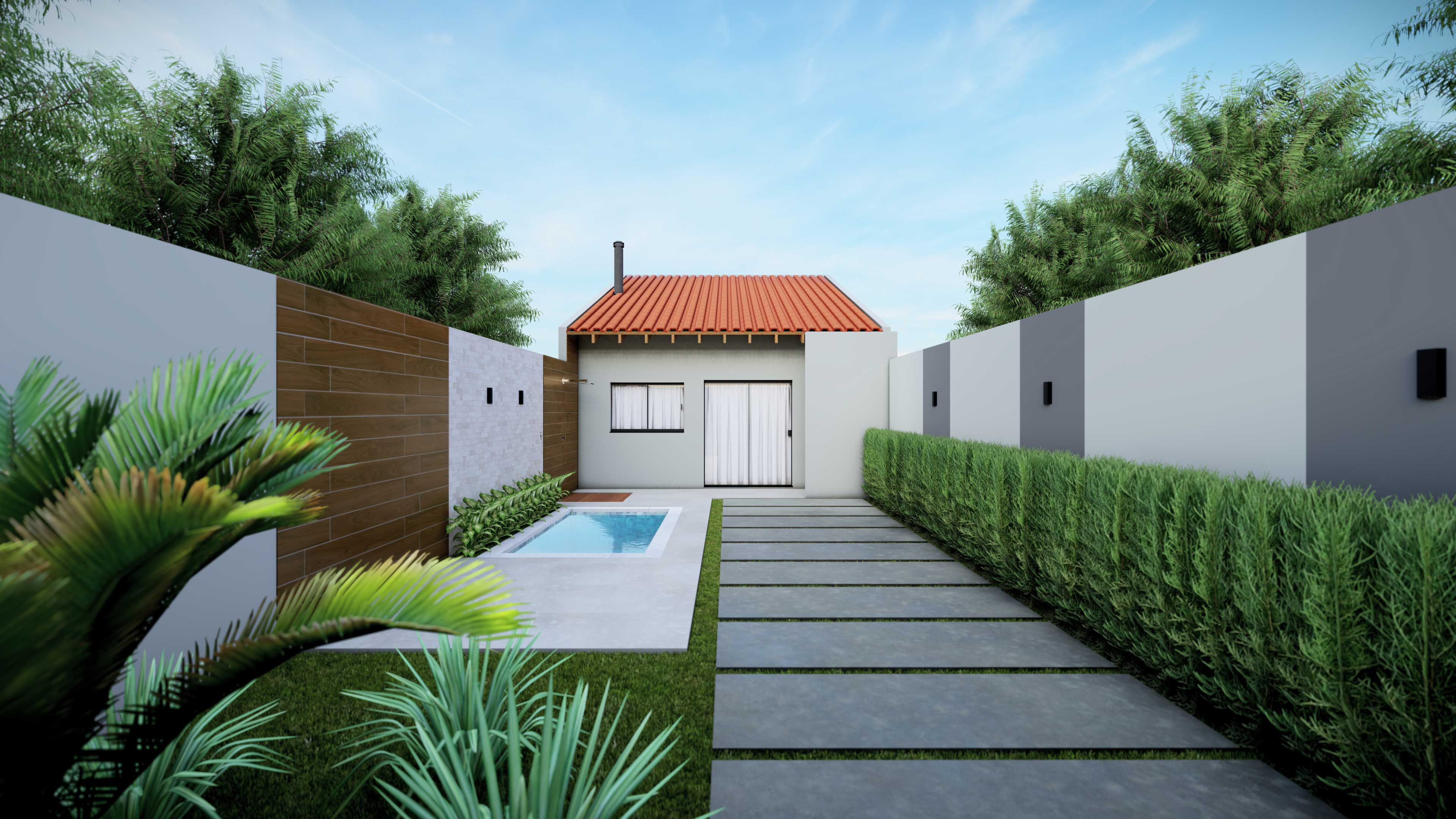 Casa térrea compacta e funcional, com 1 quarto, sala de estar, cozinha, banheiro social, área de serviço, área gourmet com churrasqueira e garagem. Projeto pensado para conforto, praticidade e integração com a área externa.
